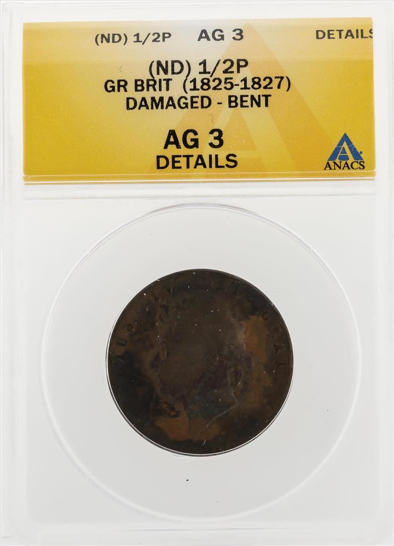 One 1825-1827 1/2 Penny Damaged Bent Coin ANACS AG 3 Details. ANACS Appraised.