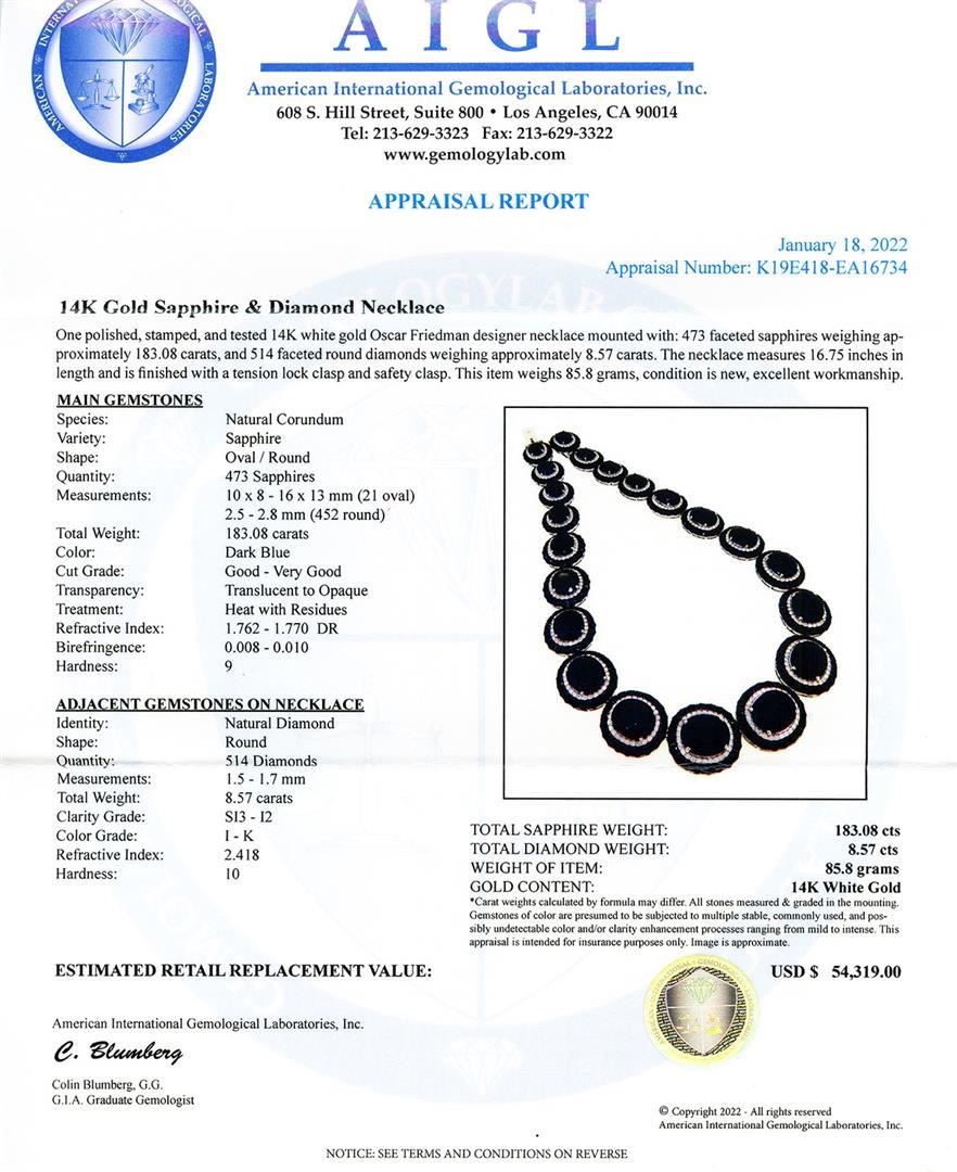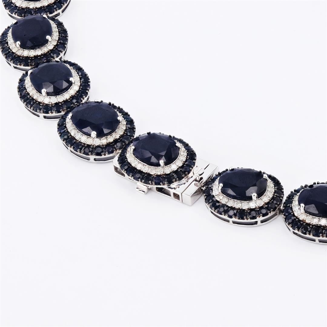 183.08ctw Dark Blue Sapphire and 8.57ctw Diamond Necklace. Please see Photos and Description for all available information. This stunning 183.08ctw Dark Blue Sapphire and 8.57ctw Diamond necklace is a supreme expression of love and affection. It features a total of 183.08ctw of dark blue sapphires set into the necklace and a total of 8.57ctw of round cut diamonds to accentuate the beauty of the sapphires. This necklace has a 16.75-inch length.