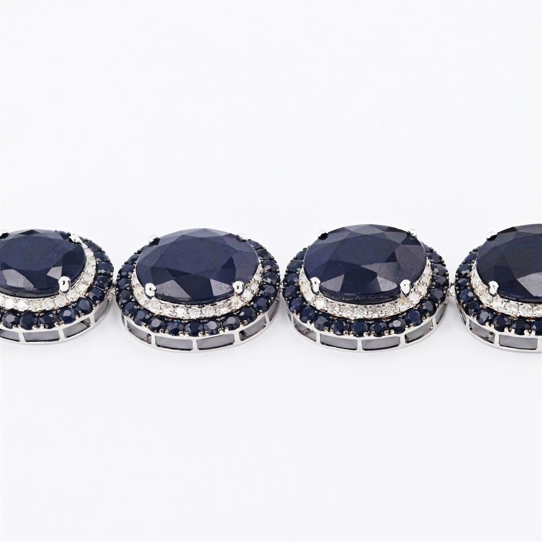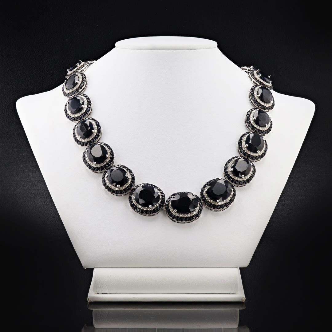 183.08ctw Dark Blue Sapphire and 8.57ctw Diamond Necklace. Please see Photos and Description for all available information. This stunning 183.08ctw Dark Blue Sapphire and 8.57ctw Diamond necklace is a supreme expression of love and affection. It features a total of 183.08ctw of dark blue sapphires set into the necklace and a total of 8.57ctw of round cut diamonds to accentuate the beauty of the sapphires. This necklace has a 16.75-inch length.