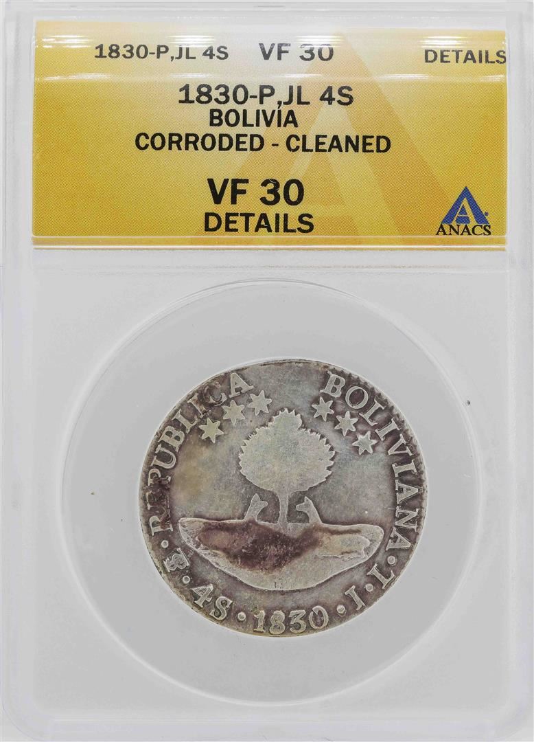 One 1830-P JL Bolivia 4 Soles Coin ANACS VF30 Details. ANACS Appraised.