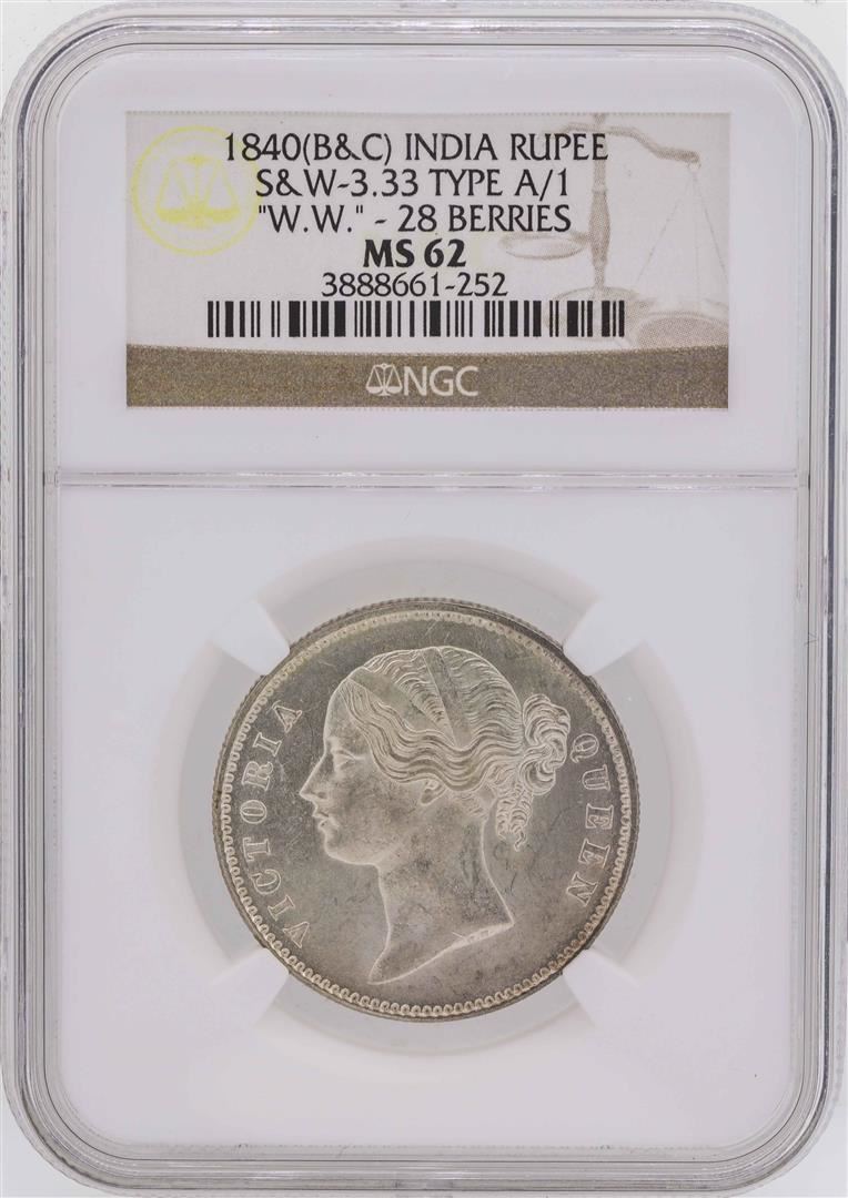 One 1840 (B&C) India Rupee Coin S & W 3.33 Type A/1 NGC MS62. NGC Certified.