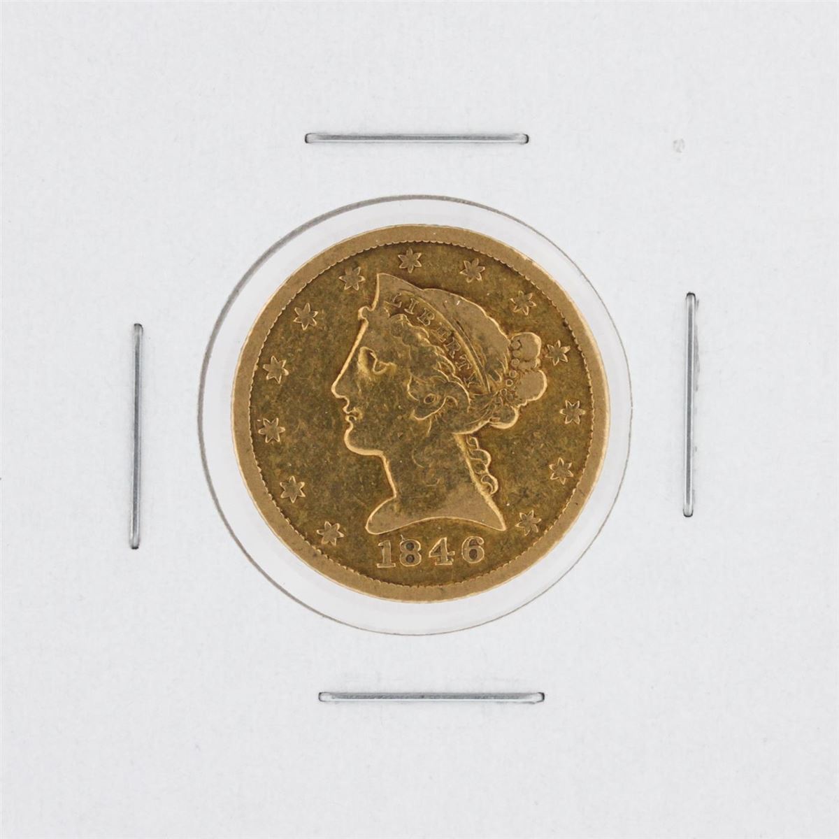 One 1846 $5 F Liberty Head Half Eagle Coin.