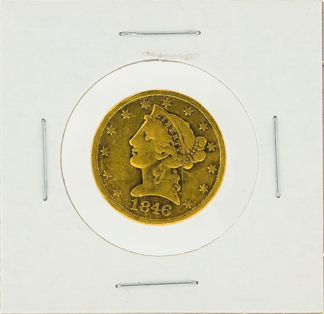 One 1846 $5 No Motto Liberty Head Half Eagle Gold Coin.