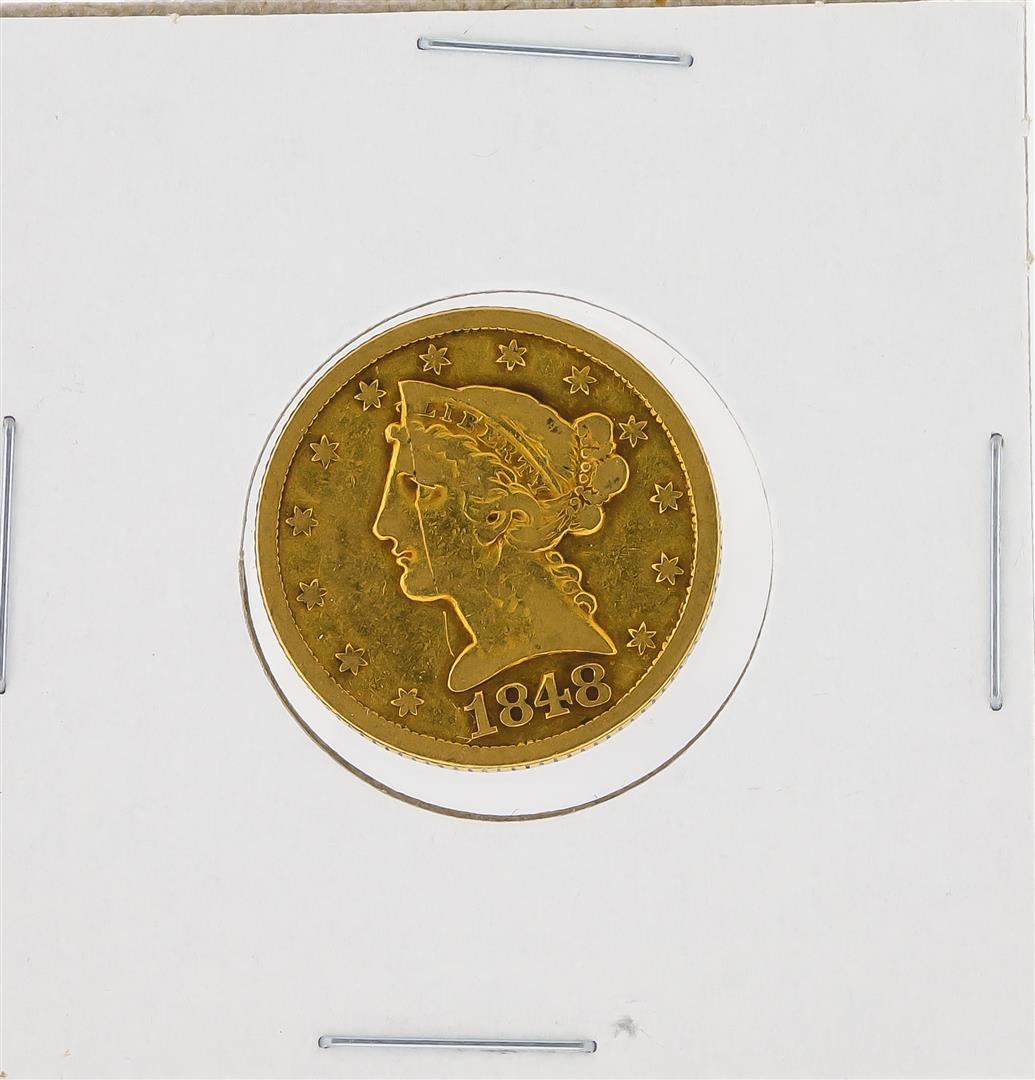 One 1848 $5 Liberty Head Half Eagle Gold Coin.