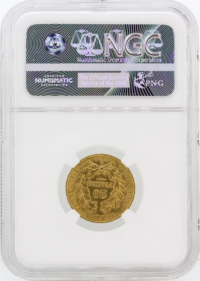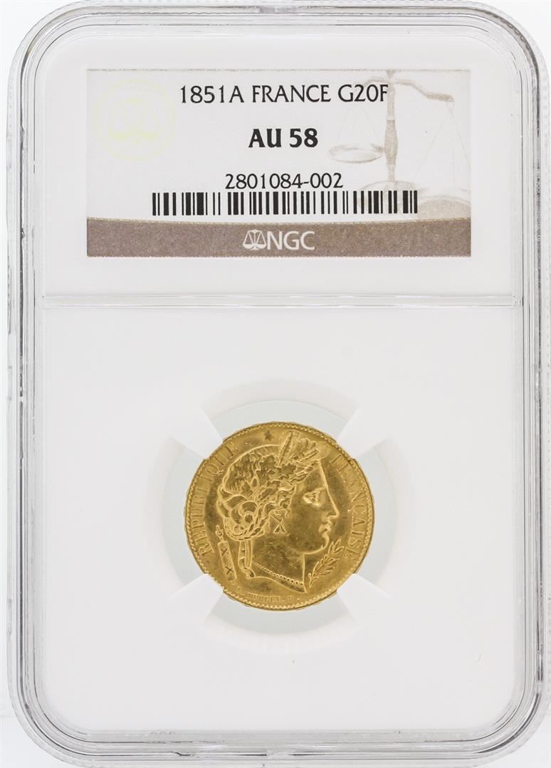 One 1851-A NGC AU58 France G20F Gold Coin. NGC Certified.