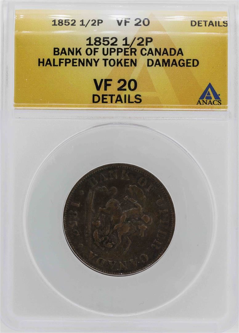 One 1852 Canada 1/2 Penny Bank of Upper Canada Token ANACS VF20 Details. ANACS Appraised.