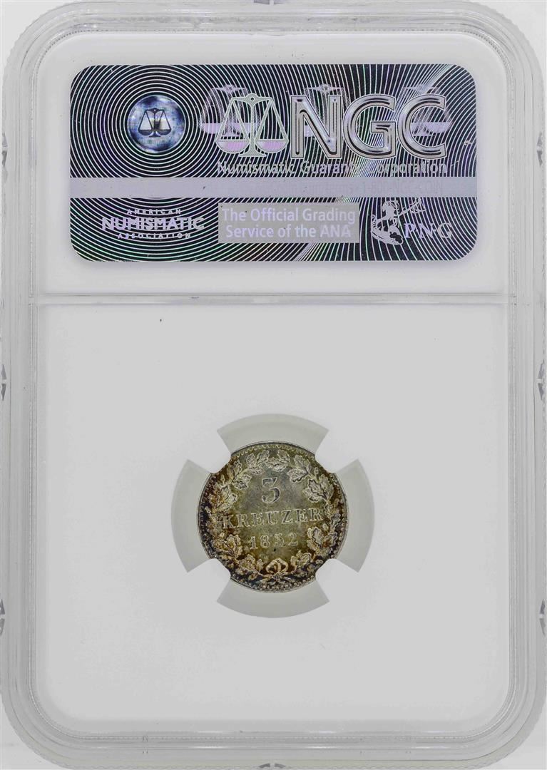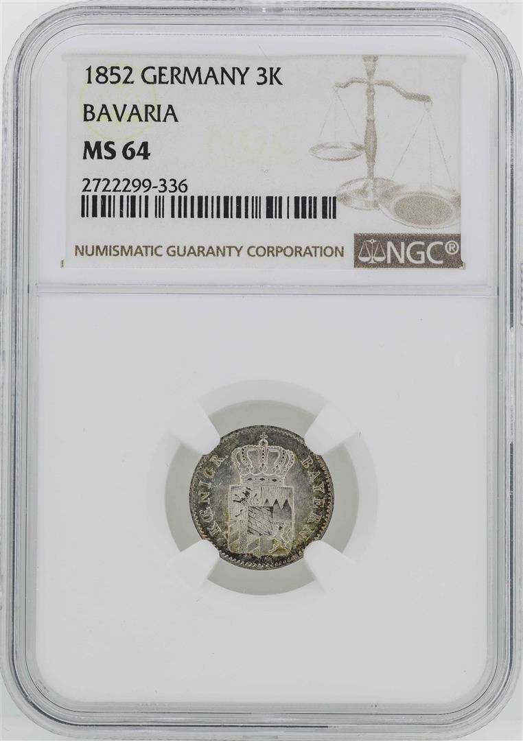 One 1852 Germany Bavaria 3 Kreuzer Coin NGC MS64. NGC Certified.