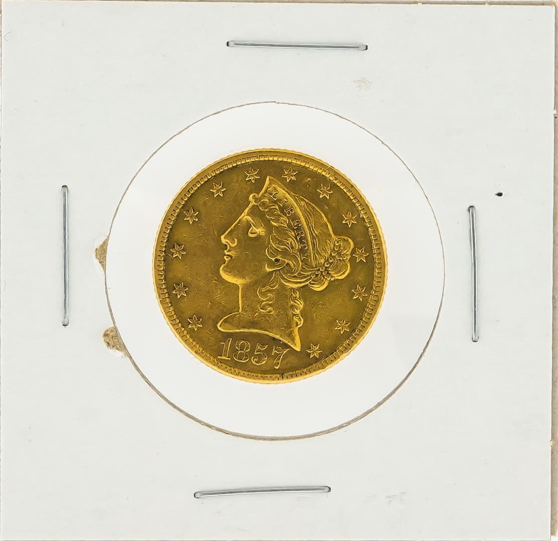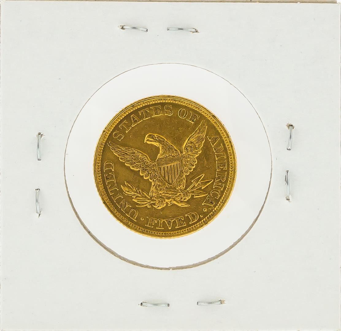 One 1857 $5 No Motto XF Liberty Head Half Eagle Gold Coin.