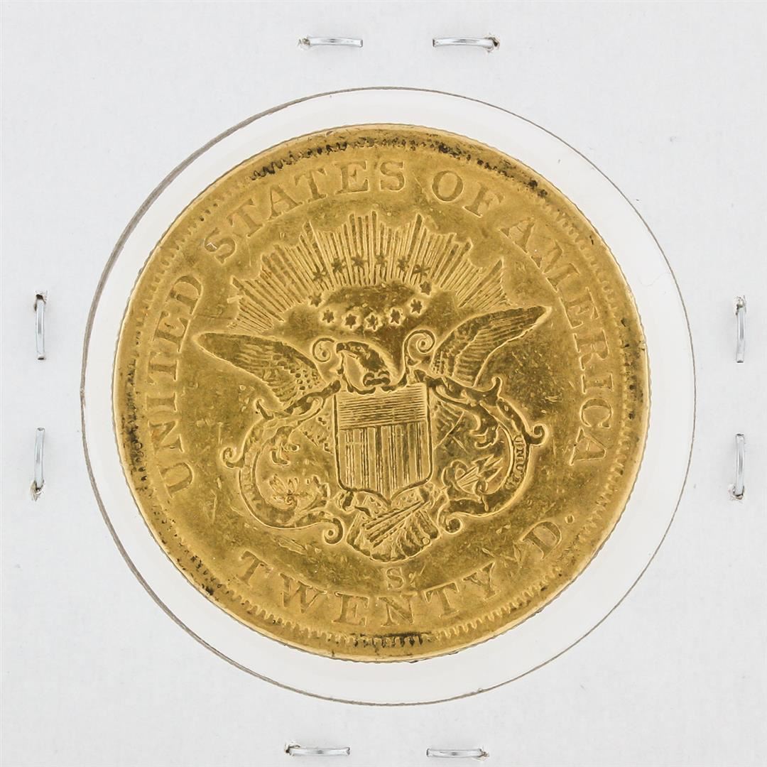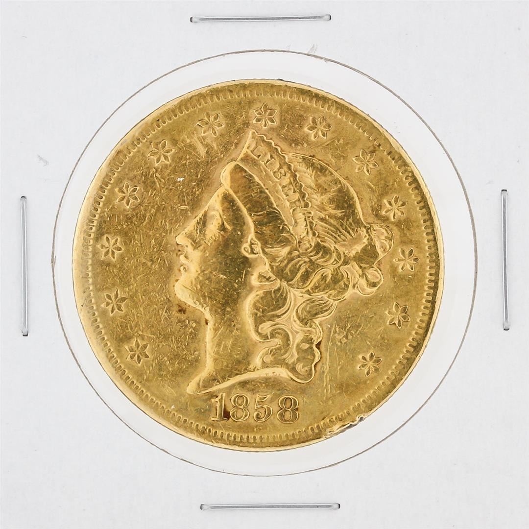 One 1858-S $20 VF Liberty Head Double Eagle Coin.