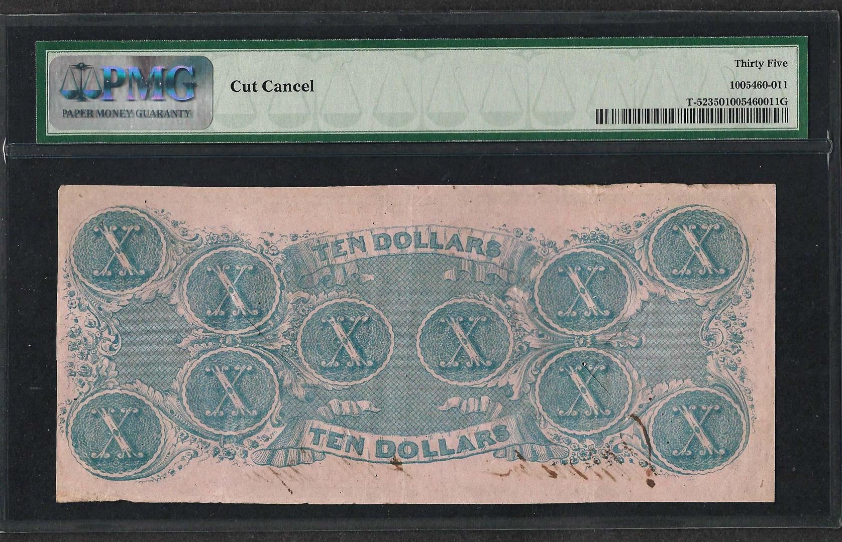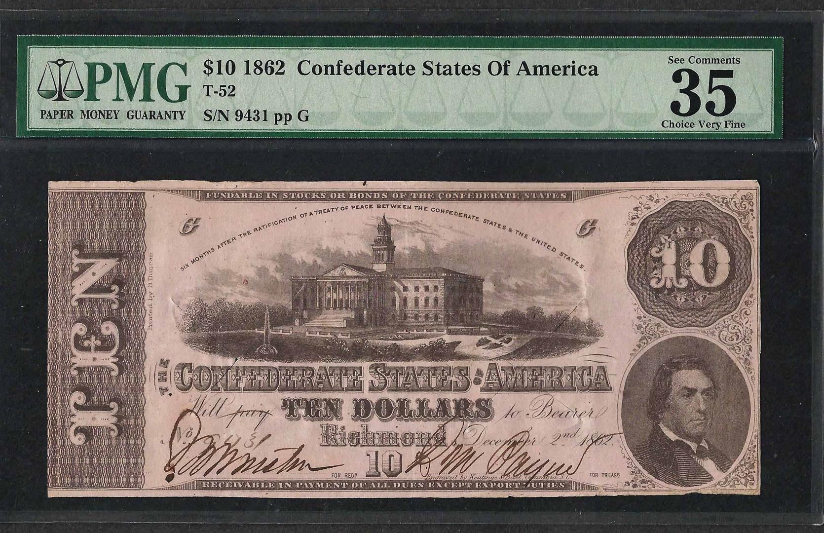 One 1862 $10 Confederate States of America Note T-52 PMG Choice Very Fine 35. PMG Appraised.