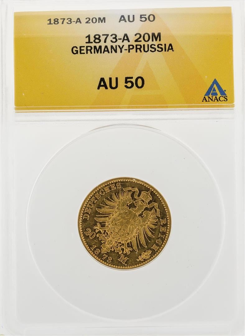 One 1873-A 20 Mark Germany Prussia Gold Coin ANACS AU50. ANACS Appraised.