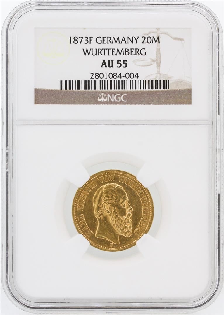 One 1873-F NGC AU55 Germany 20M Wurttemberg Gold Coin. NGC Certified.