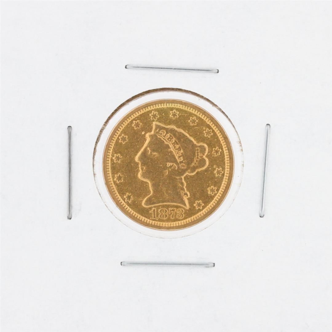One 1873-S $2.50 C- Liberty Head Closed 3 Quarter Eagle Coin.