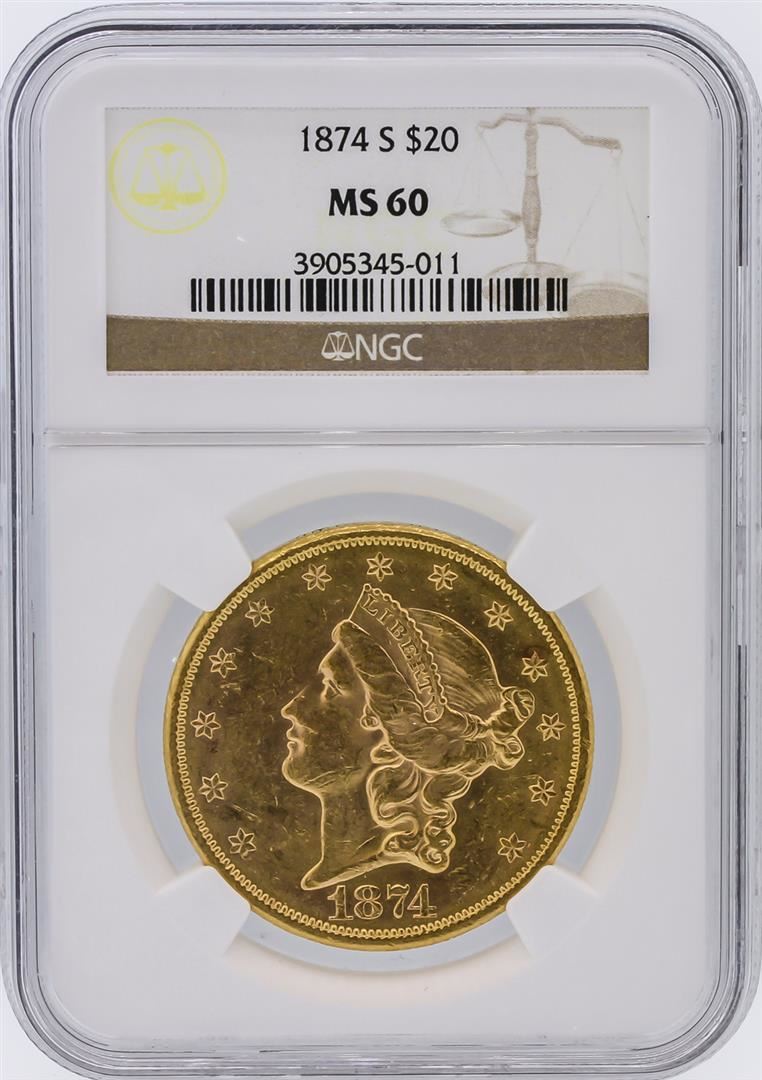 One 1874-S NGC MS60 $20 Liberty Head Double Eagle Gold Coin. NGC Certified.