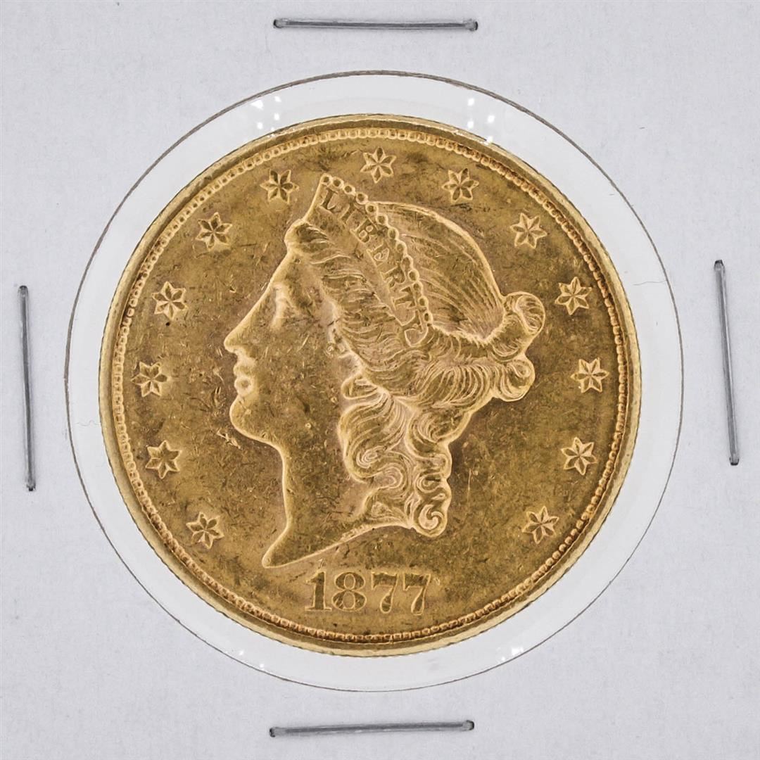 One 1877-S $20 AU Liberty Head Double Eagle Coin.