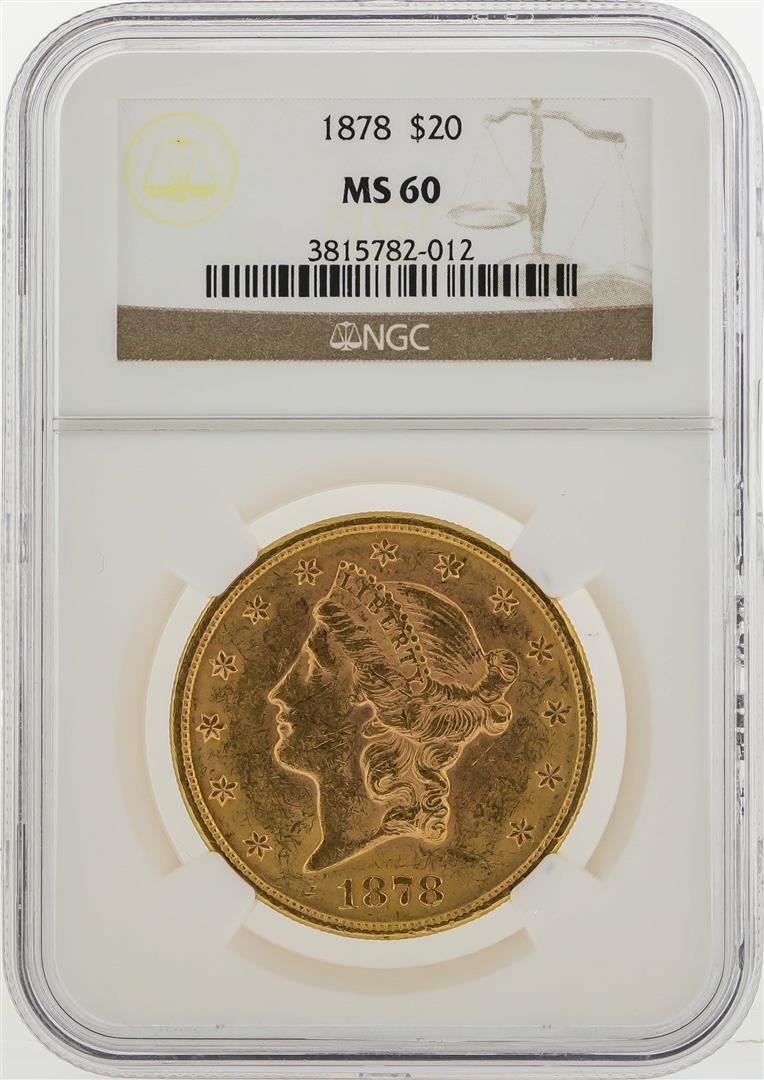 One 1878 $20 Liberty Head Double Eagle Gold Coin NGC MS60. NGC Certified.