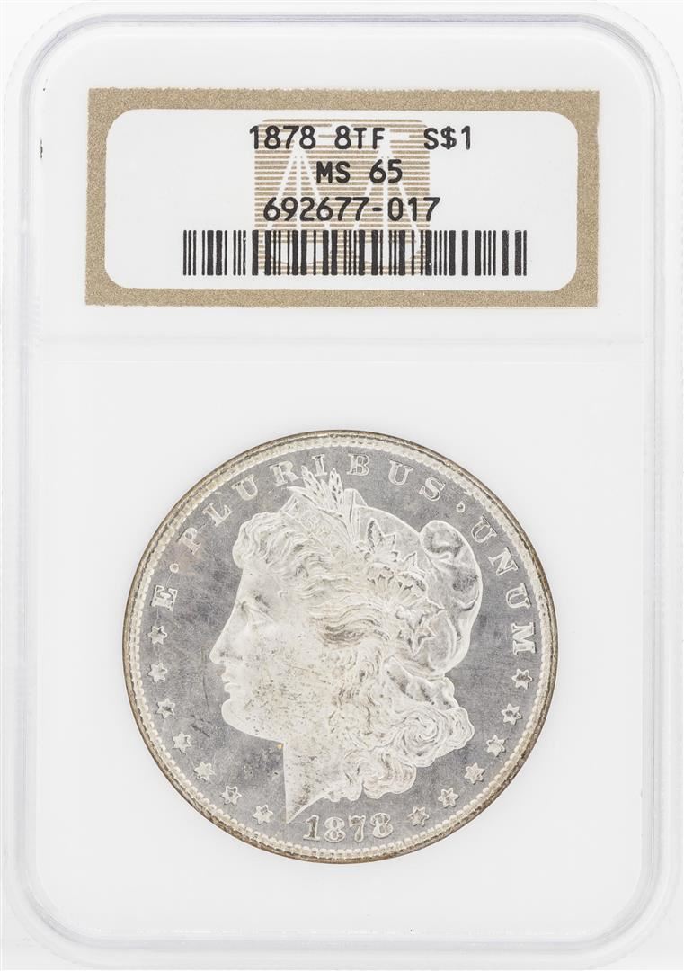 One 1878 8TF $1 Morgan Silver Dollar Coin NGC MS65. NGC Certified.