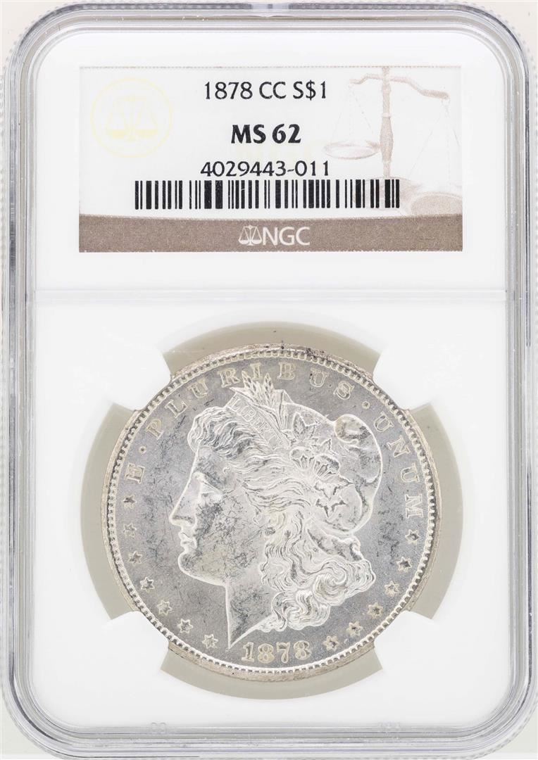 One 1878-CC $1 Morgan Silver Dollar Coin NGC MS62. NGC Certified.