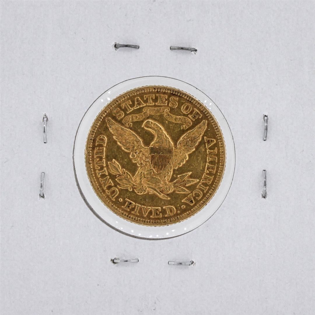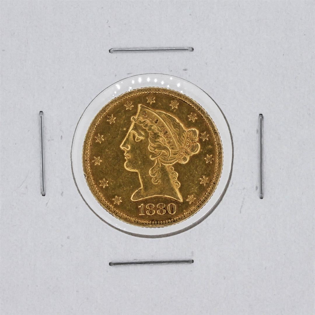 One 1880 $5 AU Liberty Head Half Eagle Coin.