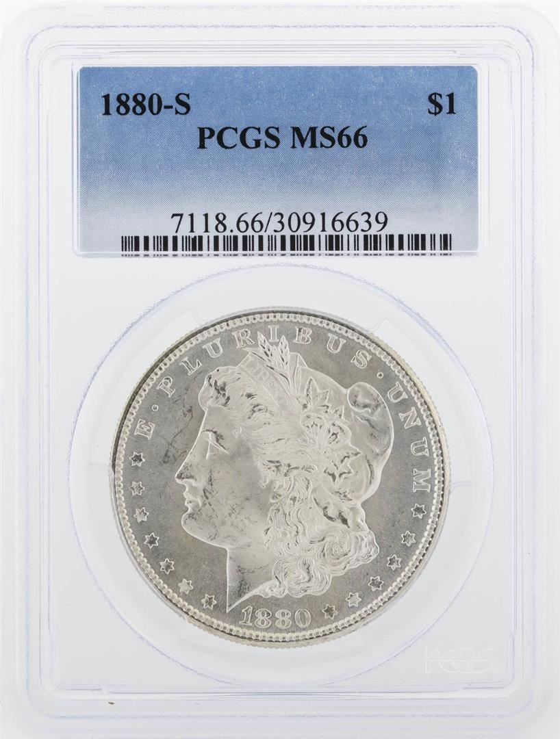 One 1880-S PCGS MS66 Morgan Silver Dollar.