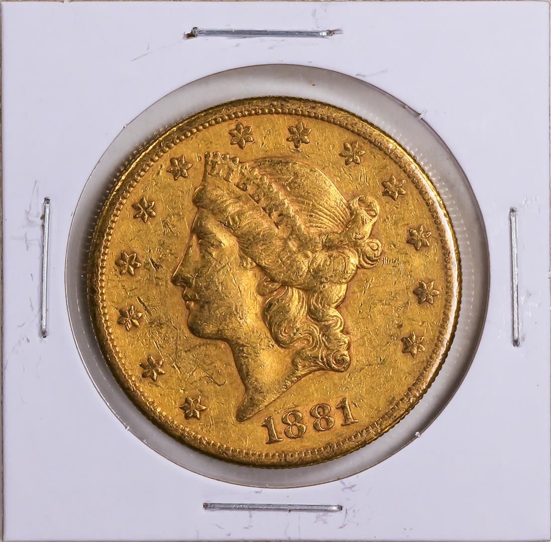 One 1881 $20 Liberty Head Double Eagle Gold Coin VF.