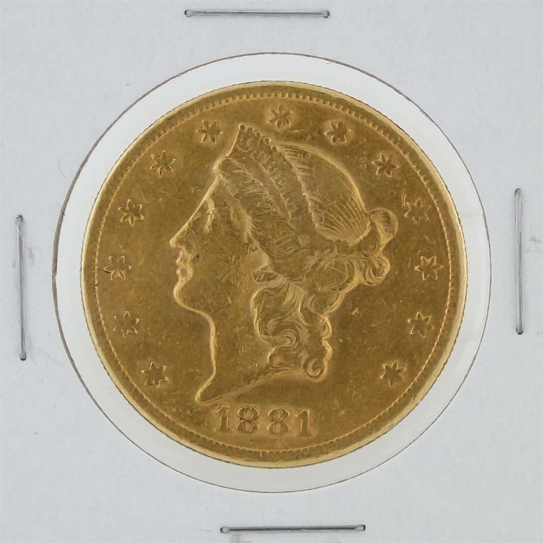 One 1881-S $20 Liberty Head Double Eagle Coin.