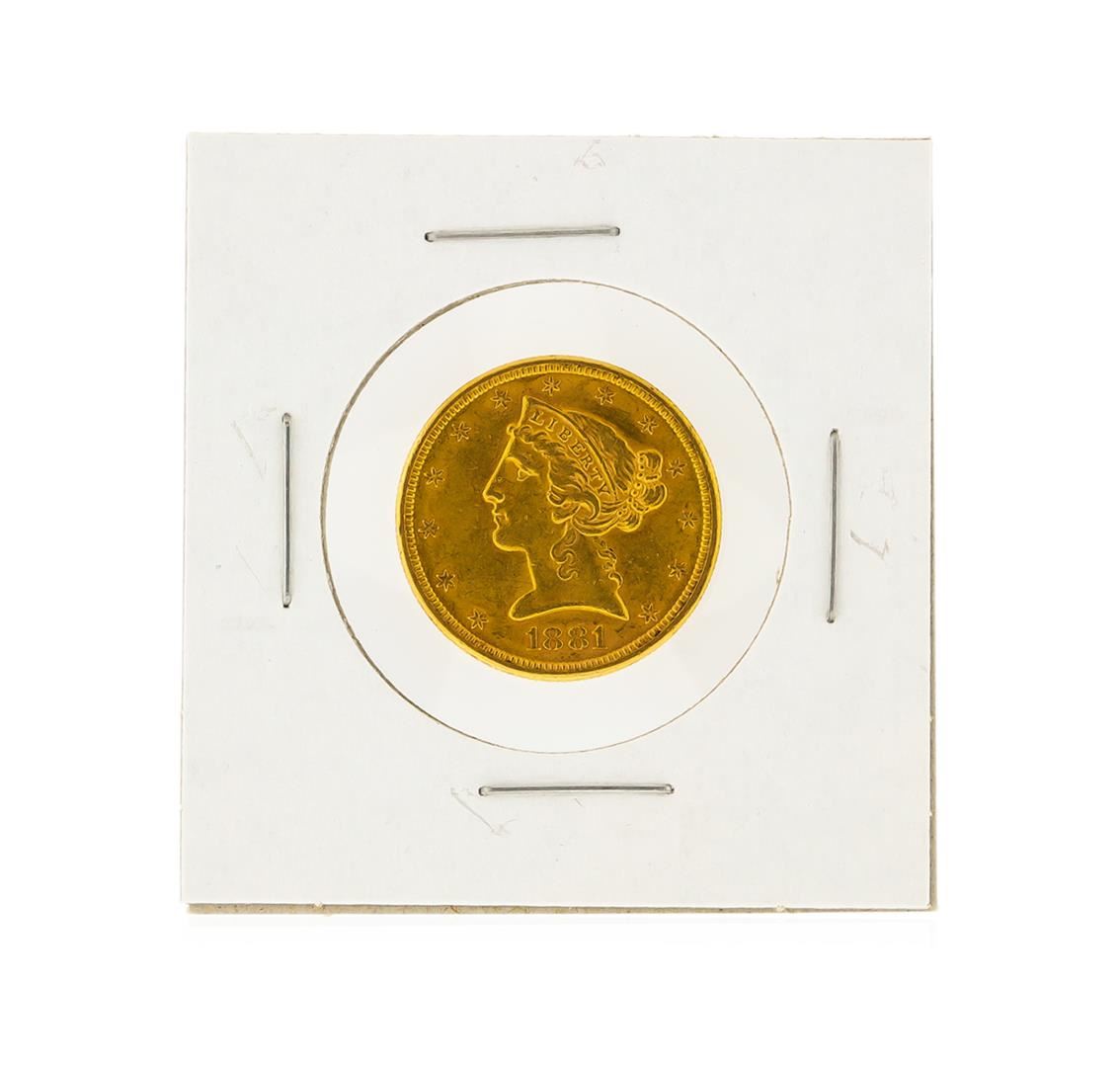 One 1881-S $5 CU Liberty Head Half Eagle Gold Coin.