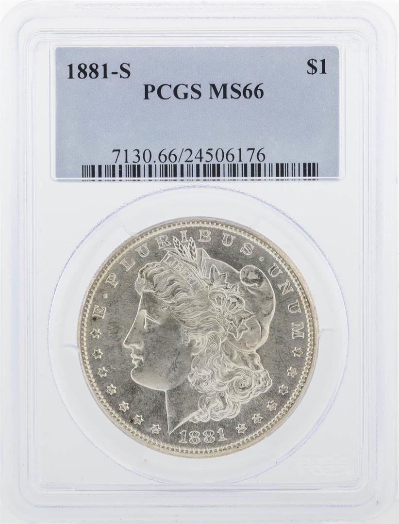 One 1881-S PCGS MS66 Morgan Silver Dollar.