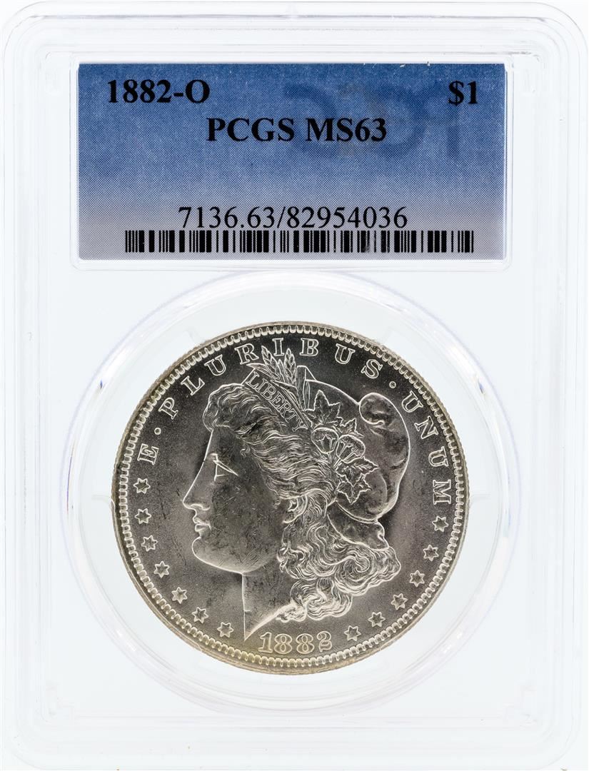 One 1882-O PCGS MS63 Morgan Silver Dollar.