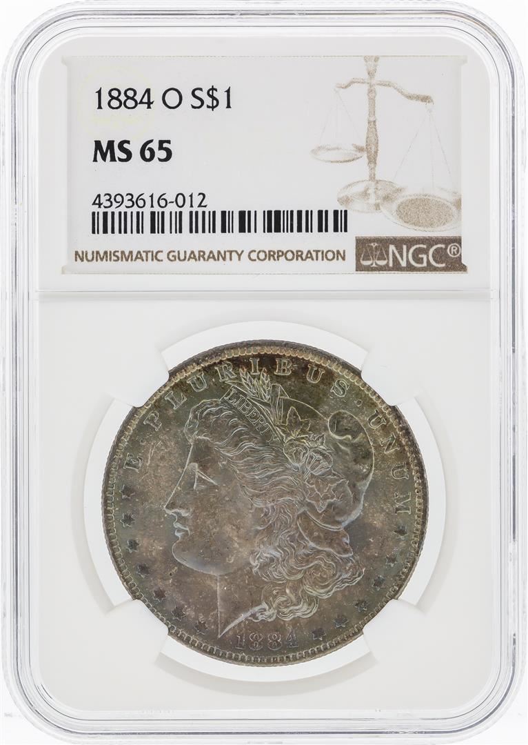 One 1884-O $1 Morgan Silver Dollar Coin w/ Nice Toning NGC MS65. NGC Certified.