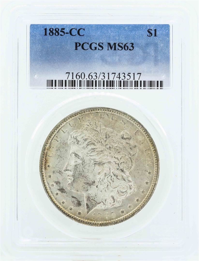One 1885-CC $1 Morgan Silver Dollar Coin PCGS MS63. PCGS Certified.