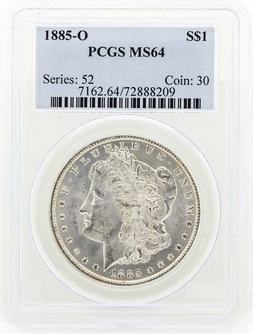 One 1885-O MS64 Morgan Silver Dollar.