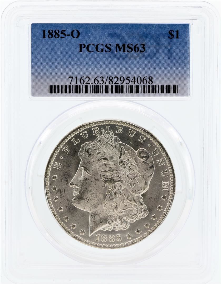 One 1885-O PCGS MS63 Morgan Silver Dollar.