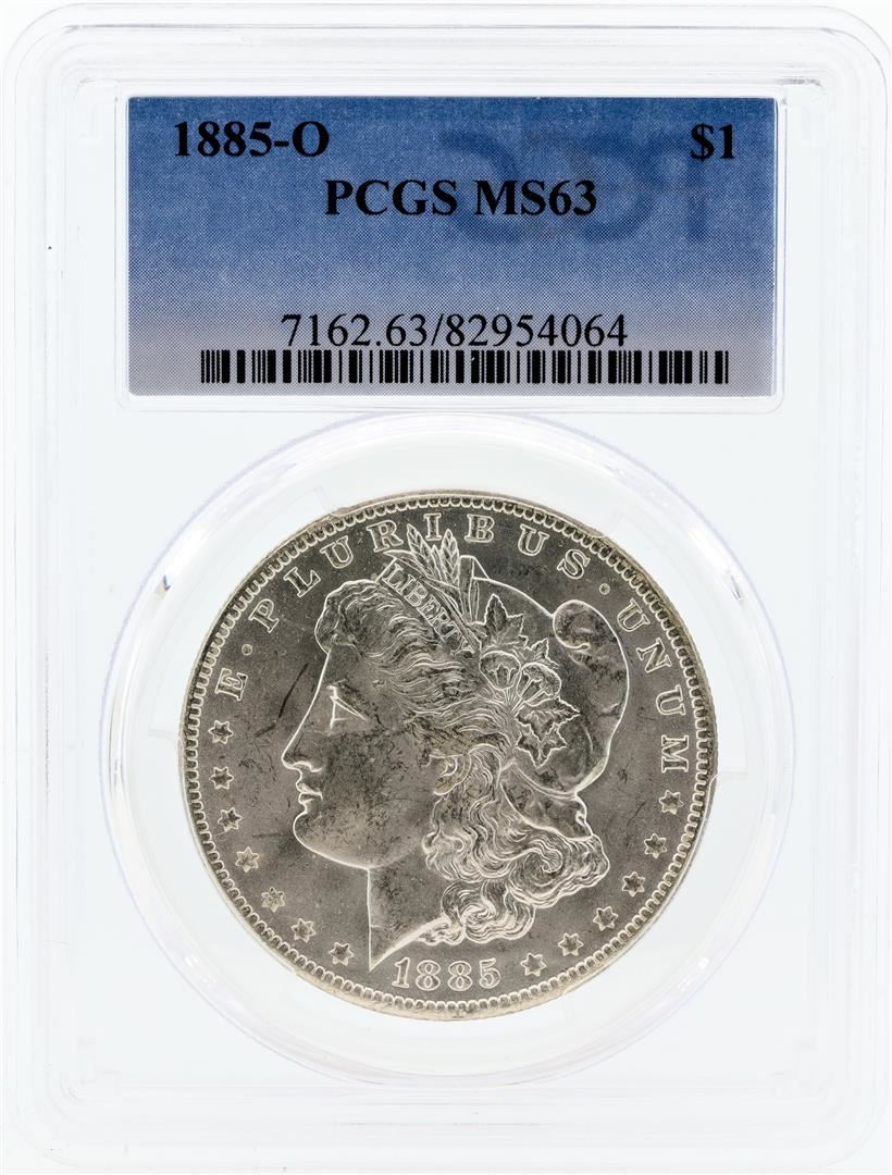 One 1885-O PCGS MS63 Morgan Silver Dollar.