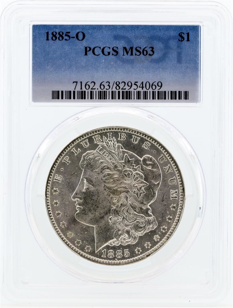 One 1885-O PCGS MS63 Morgan Silver Dollar.