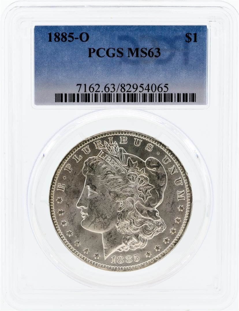 One 1885-O PCGS MS63 Morgan Silver Dollar.