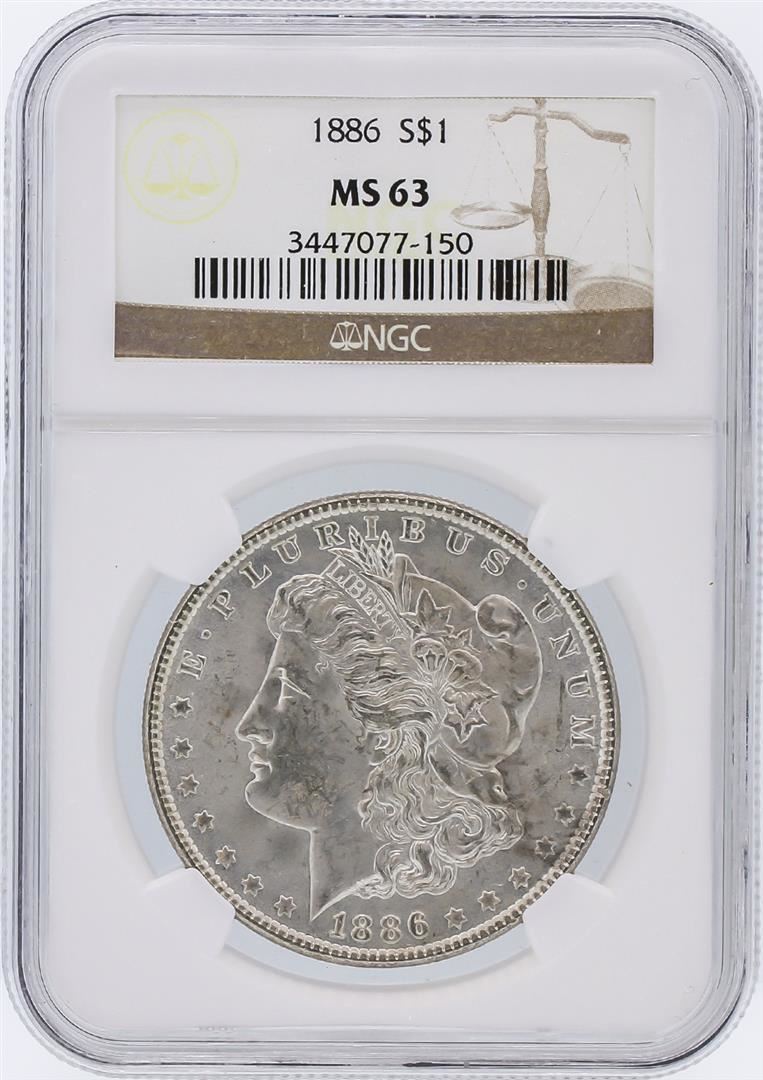 One 1886 NGC MS63 Morgan Silver Dollar.