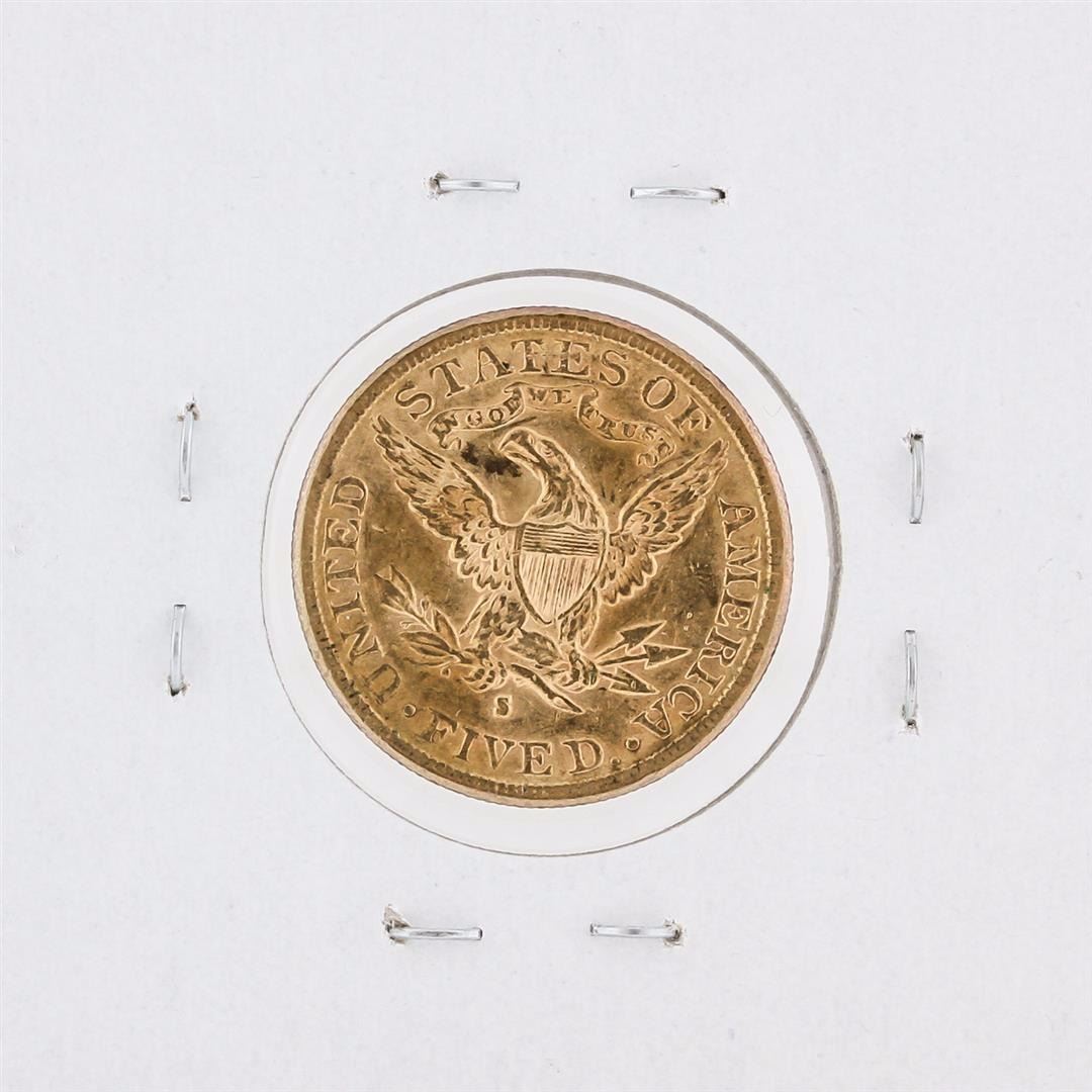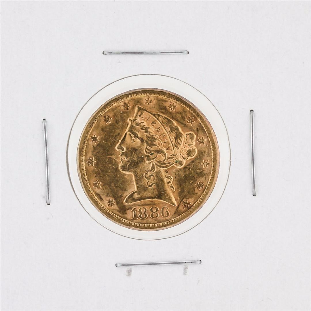 One 1886-S $5 AU Liberty Head Half Eagle Coin.