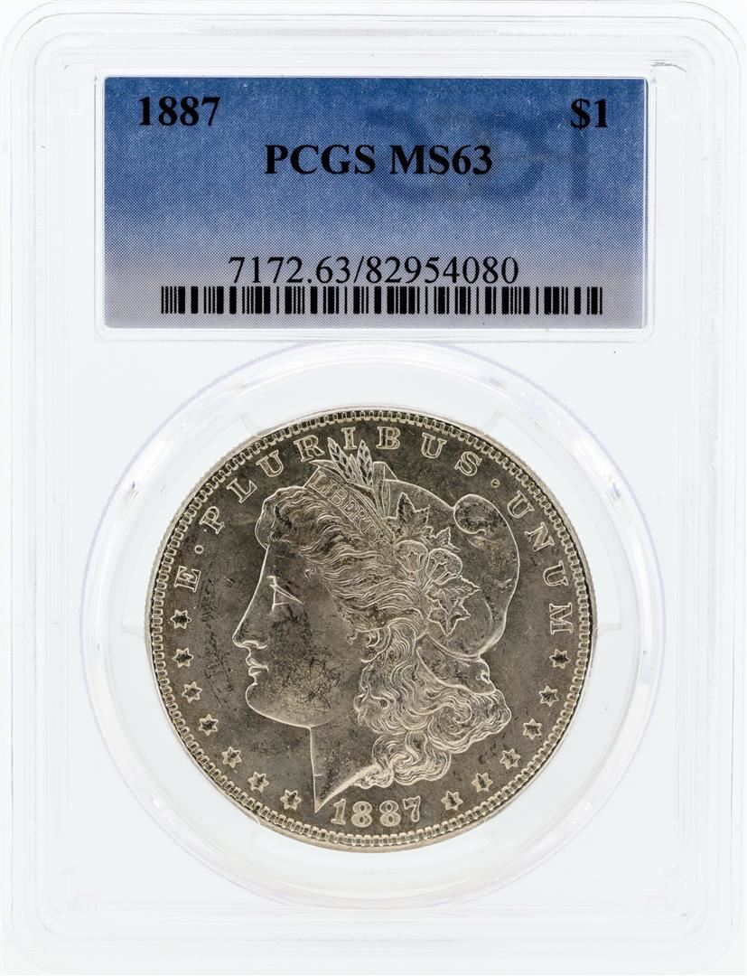 One 1887 PCGS MS63 Morgan Silver Dollar.