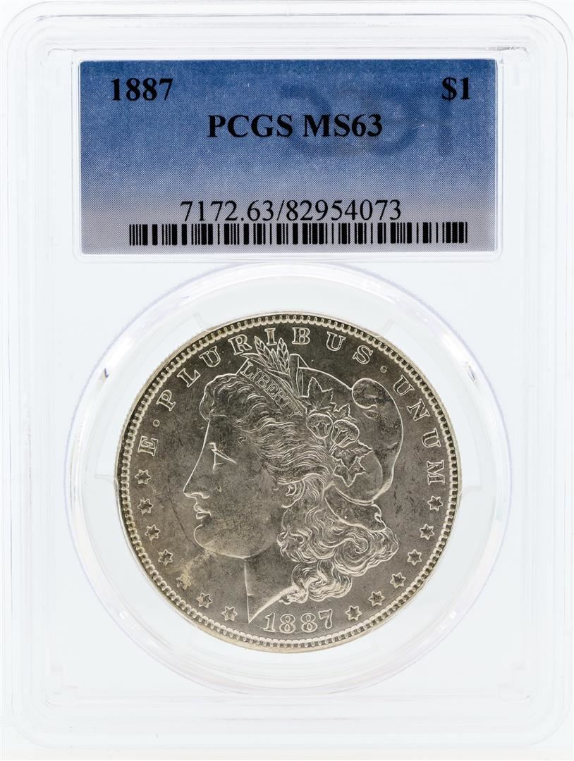 One 1887 PCGS MS63 Morgan Silver Dollar.