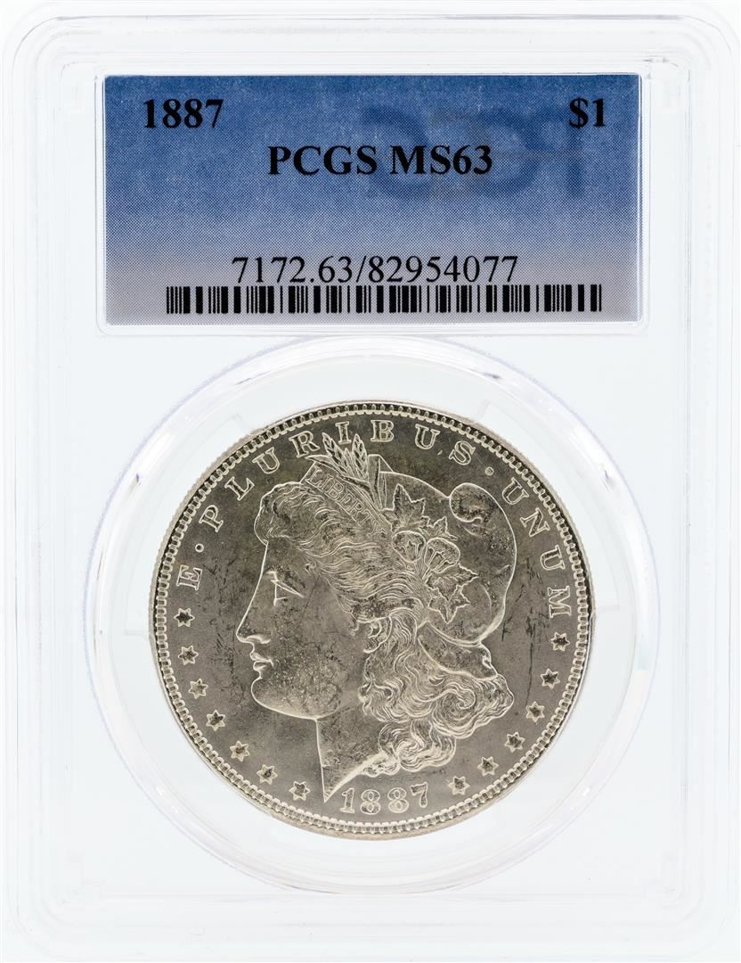 One 1887 PCGS MS63 Morgan Silver Dollar.