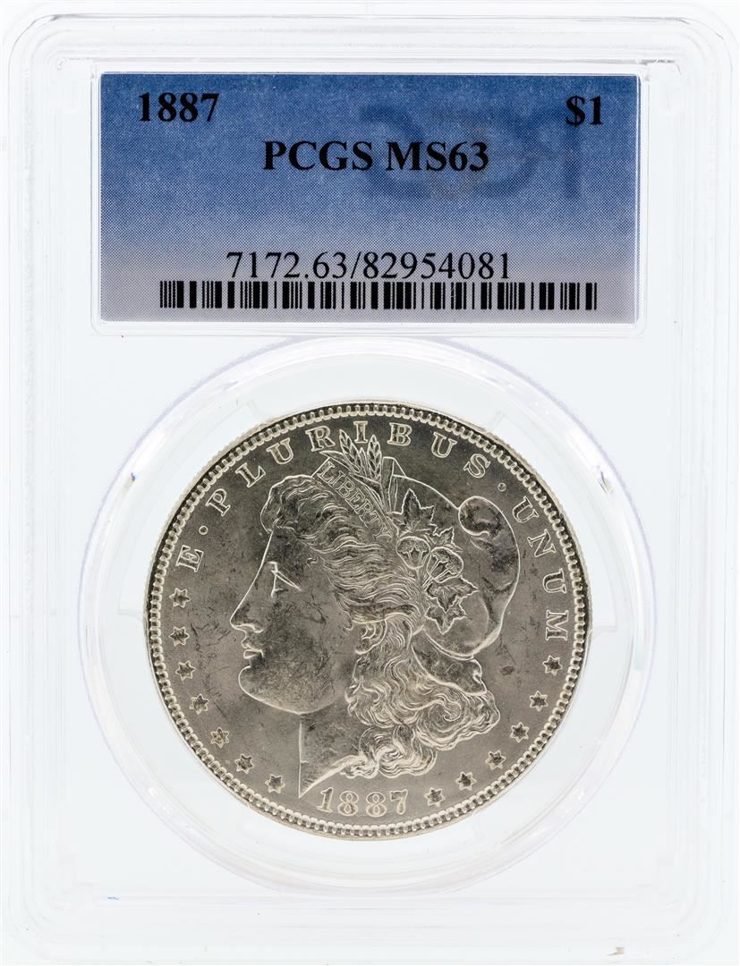 One 1887 PCGS MS63 Morgan Silver Dollar.