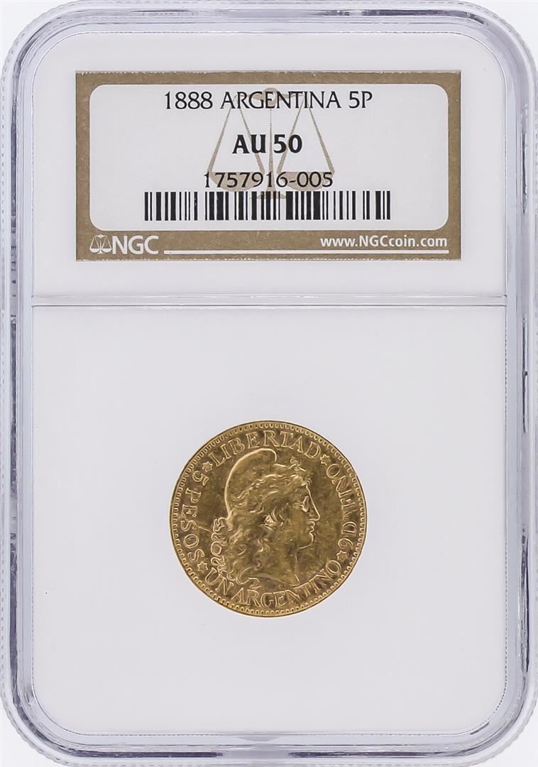 One 1888 NGC AU50 Argentina 5 Pesos Gold Coin. NGC Certified.
