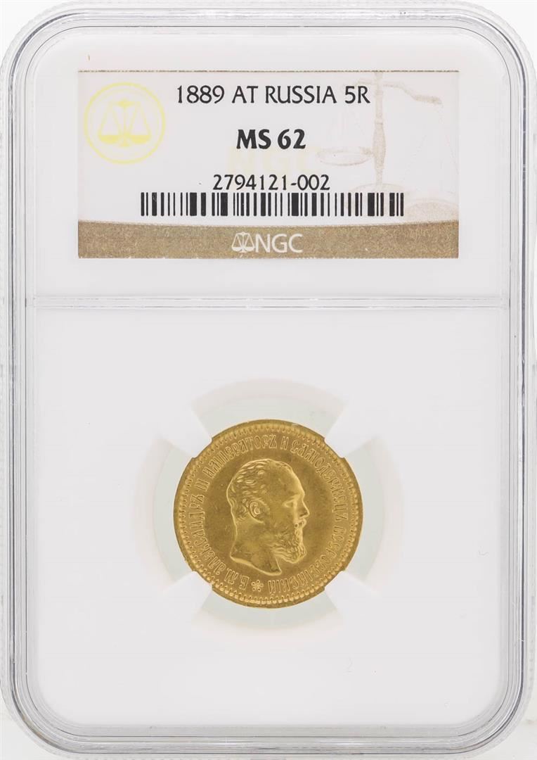 One 1889 NGC MS62 Russia 5R Gold Coin.