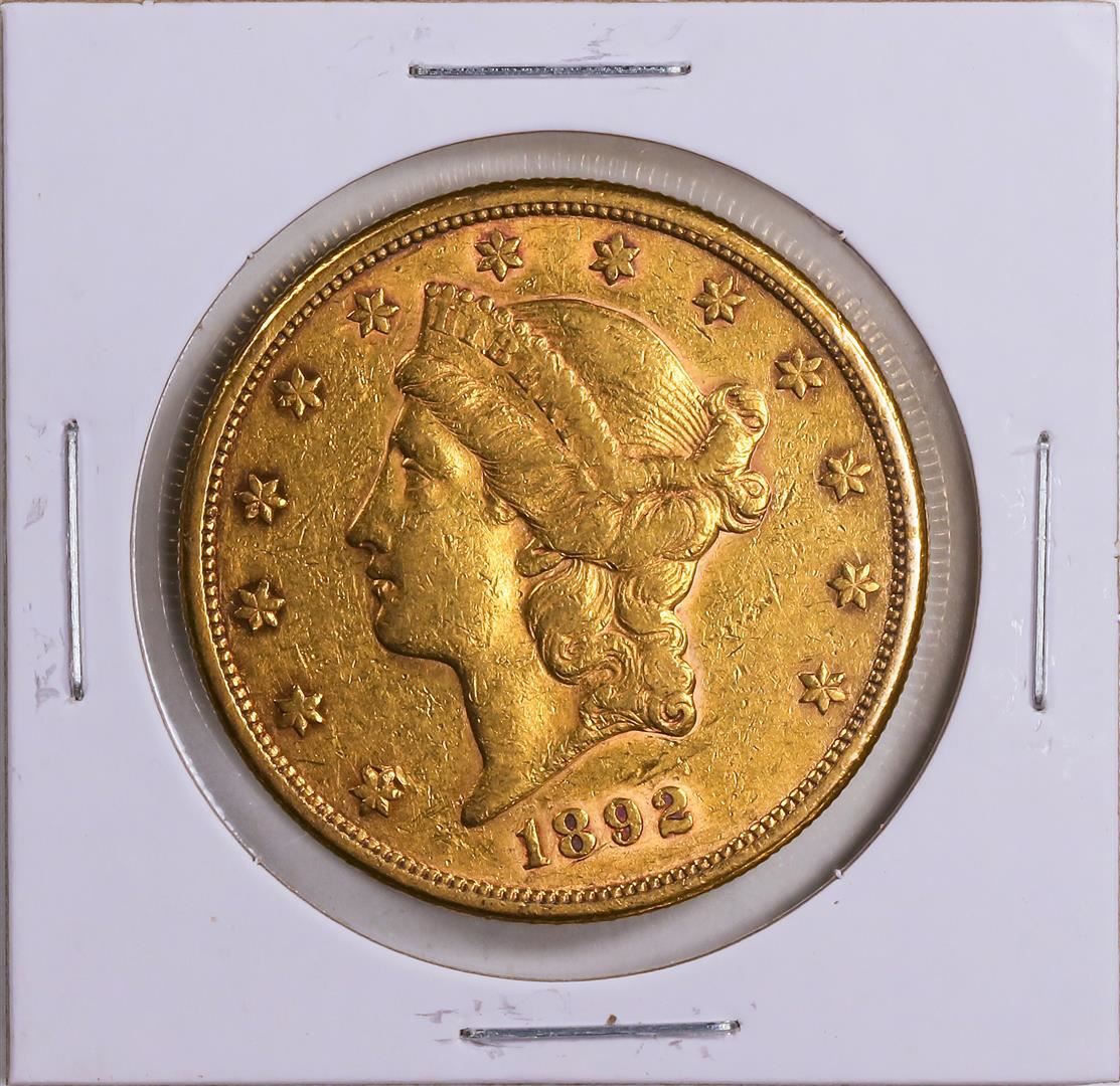 One 1892 $20 Liberty Head Double Eagle Gold Coin VF.