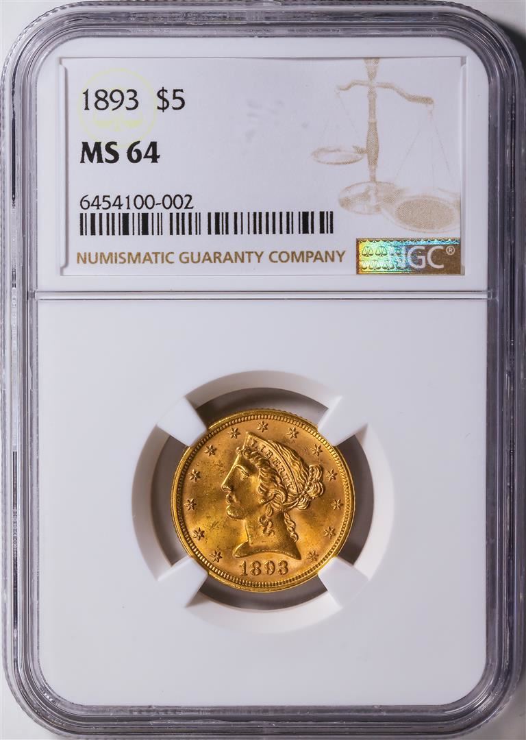 One 1893 $5 Liberty Head Half Eagle Gold Coin NGC MS64.