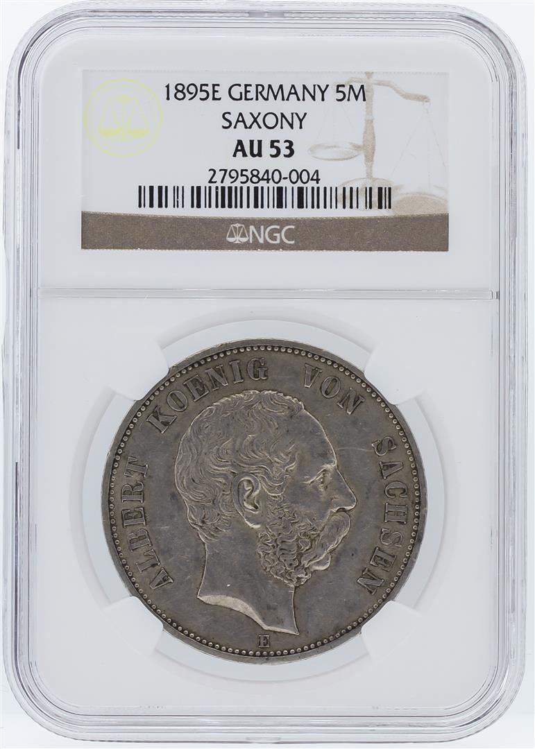 One 1895-E NGC AU53 Germany 5M Saxony Coin. NGC Certified.