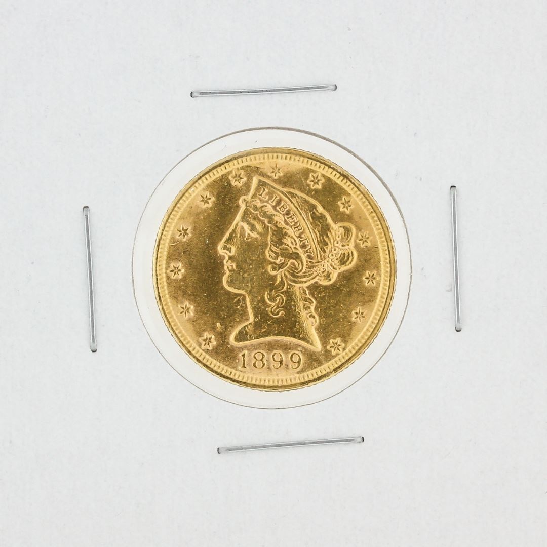 One 1899 $5 Liberty Head Half Eagle Gold Coin.