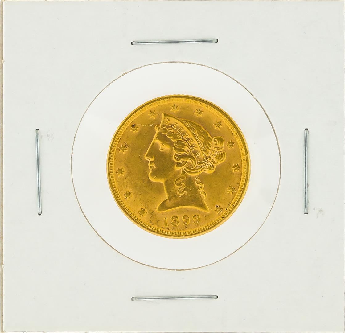 One 1899 $5 Liberty Head Half Eagle Gold Coin.