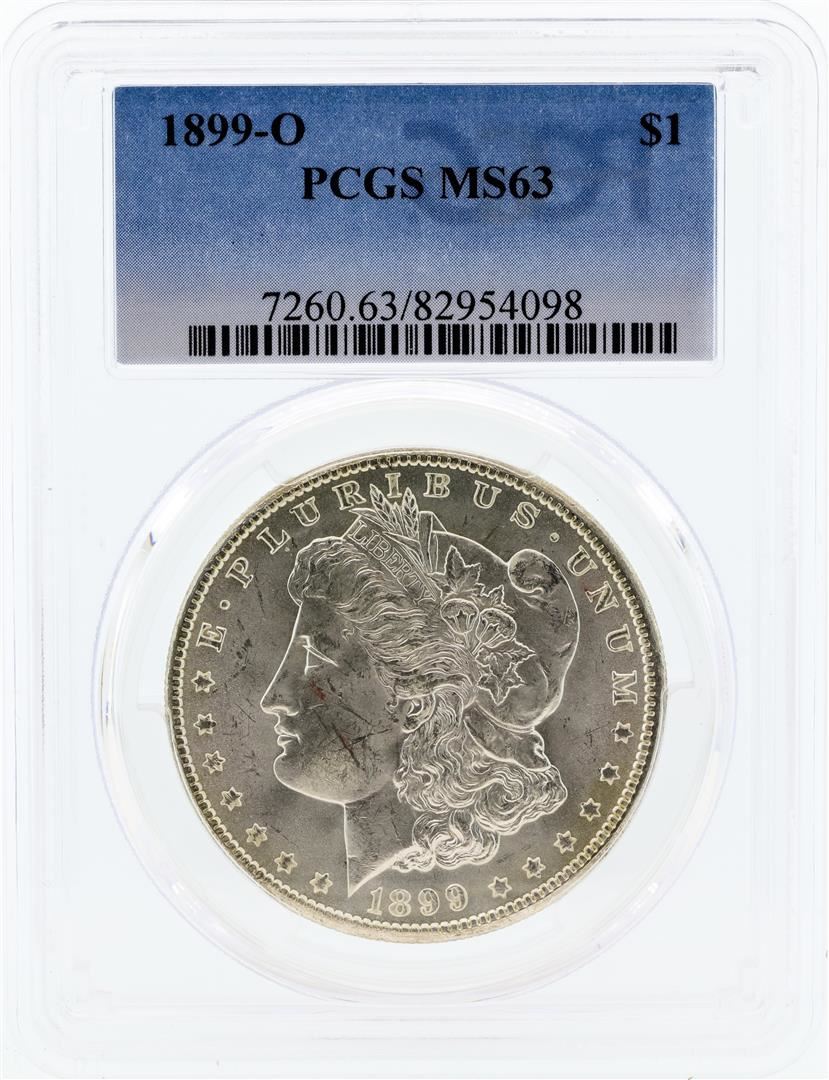 One 1899-O PCGS MS63 Morgan Silver Dollar.